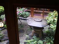 奥には堀コタツ式の個室もあったが、驚いたのは中庭に少しの緑としし威しがあったこと。