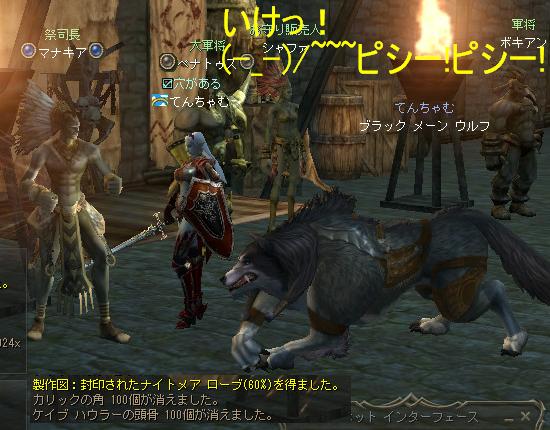 ハズレのメアローブ図が出そうだったので、ウルフに殴りかかる準備をさせていたところ、間違って交換前に殴ってしまい、マナキア様のお怒りを買ってしまいました。。。