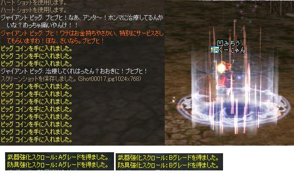 念願の豚イベントアイテムのキューピッドの弓(こちらはメンテ後もなくならないほう)、結局自力ゲットすることは叶いませんでしたが、PTでドロップした際に京都美人のお姉さまに譲っていただきました。