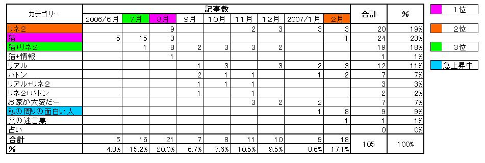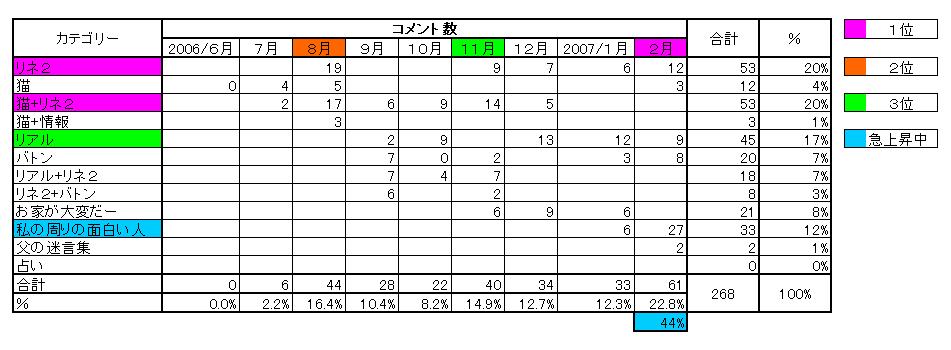 ブログ開設から2月までの8ヶ月間における、私が書いた記事数とコメント数の月・カテゴリー別の件数でございまっす。